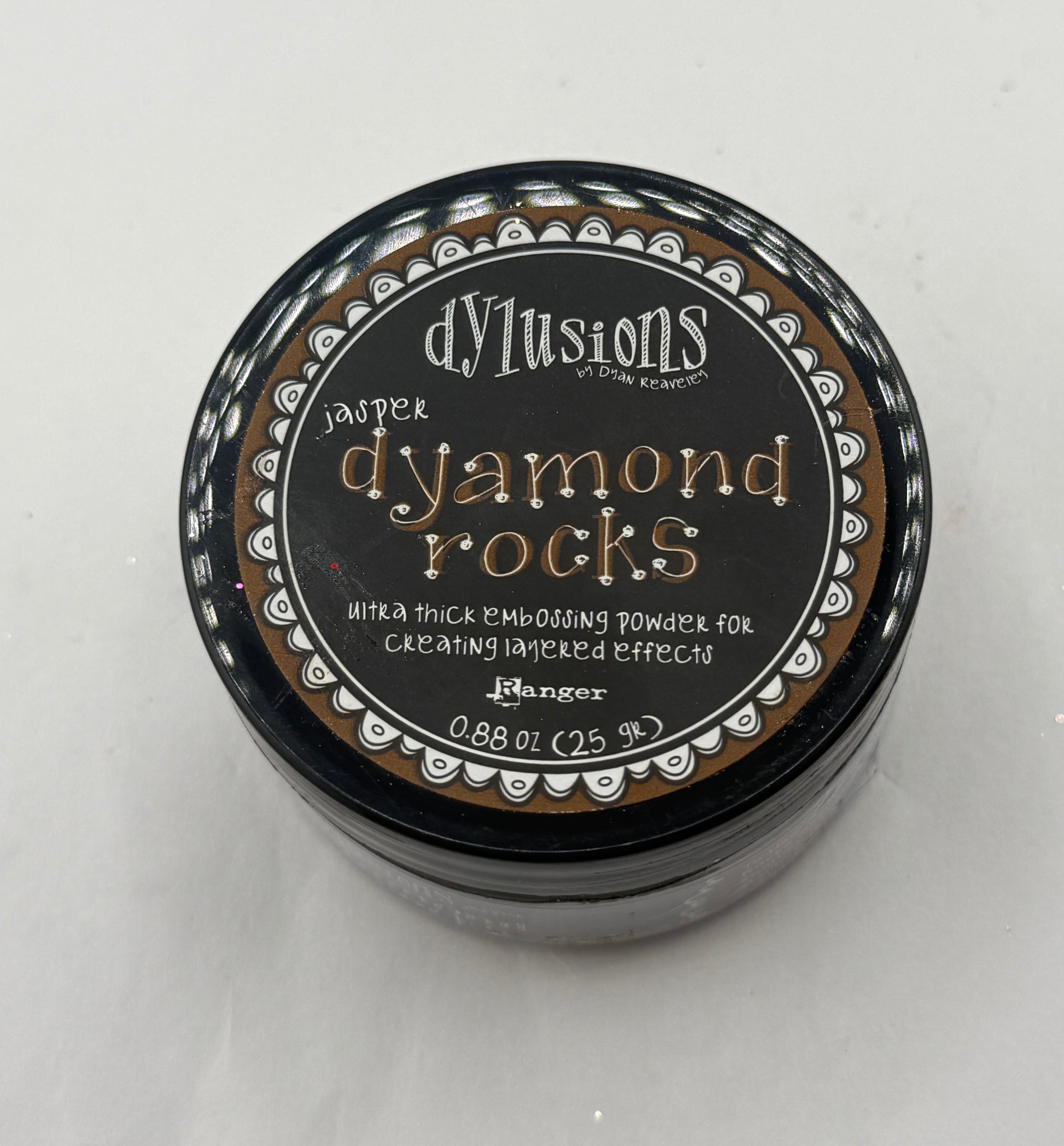Ultra thick embossing powder for creating layered effects. Add color, dimension, and texture to art journal, mixed media & paper craft projects with Dylusions Dyamond Rocks. For use with Dyamond Dust, Mediums, Boards, Stamps and more. To use: Apply Dyamond Medium to Dyamond Boards. Sprinkle Rocks over the top, tap off excess. Heat to melt. While still hot, add another layer of rocks. Repeat 3 times or to achieve desired thickness. Ink stamp with Dyamond medium and stamp into the hot layers. Leave to cool. Remove stamp and decorate with Dyamond Dust.